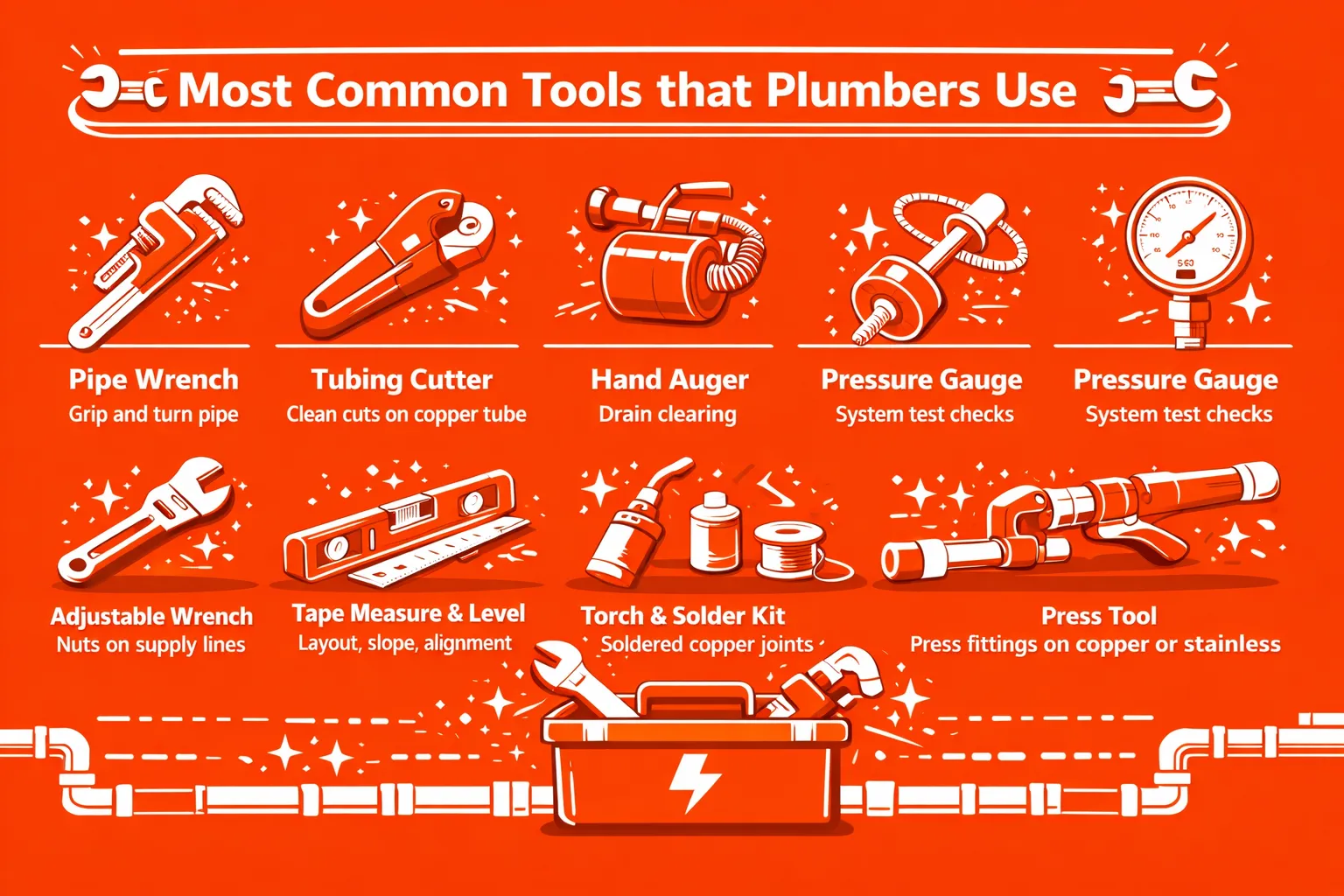 The most common tools that a plumber uses are pipe gripping tools, measuring tools, cutting tools, joining tools, test tools, and drain service tools.
