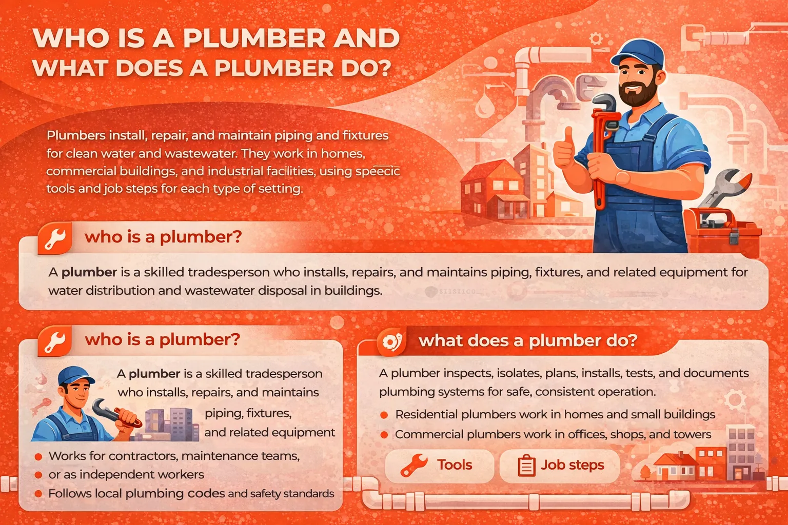 A plumber keeps clean water moving in, used water moving out, and fixtures working as intended, using code based methods for sizing, joining, testing, and safety. The work covers homes, shops, towers, and industrial sites, with different tools and job steps for each setting. This guide explains what a plumber does, how residential and commercial work differs, what skills and tools matter, what benefits and hazards come with the trade, how people qualify in Canada, what pay data looks like, how to pick a qualified plumber, and when to call one.