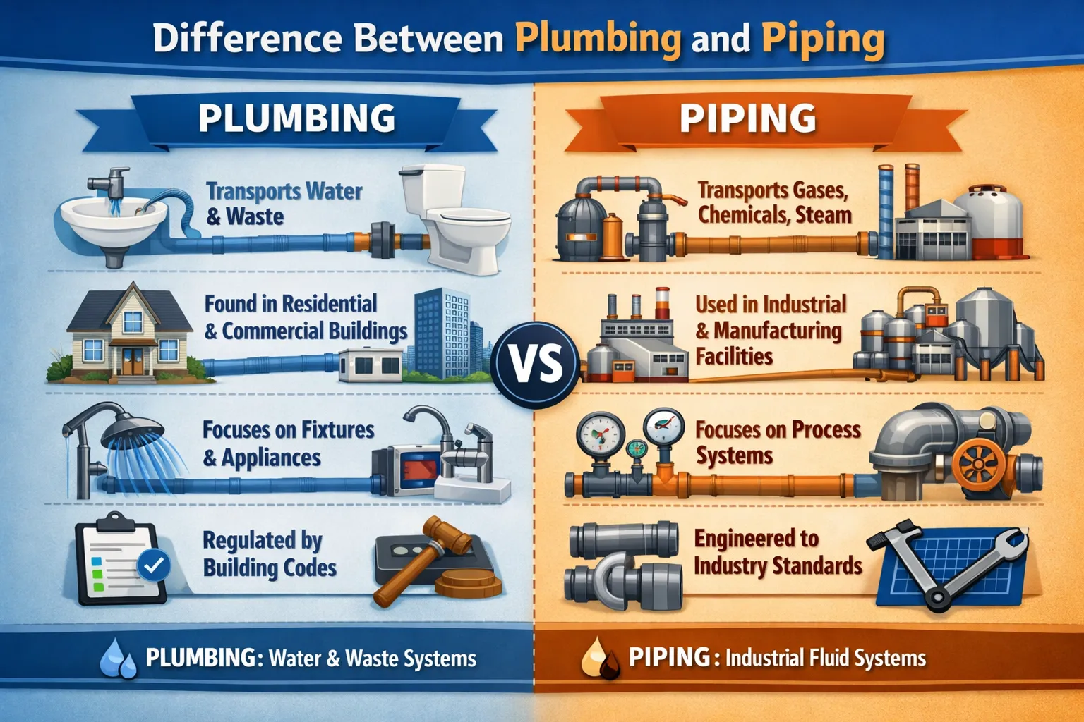 The Difference between plumbing and piping is plumbing handles water supply and waste inside homes and commercial buildings, while piping carries process fluids like gases, chemicals, and steam in industrial plants.