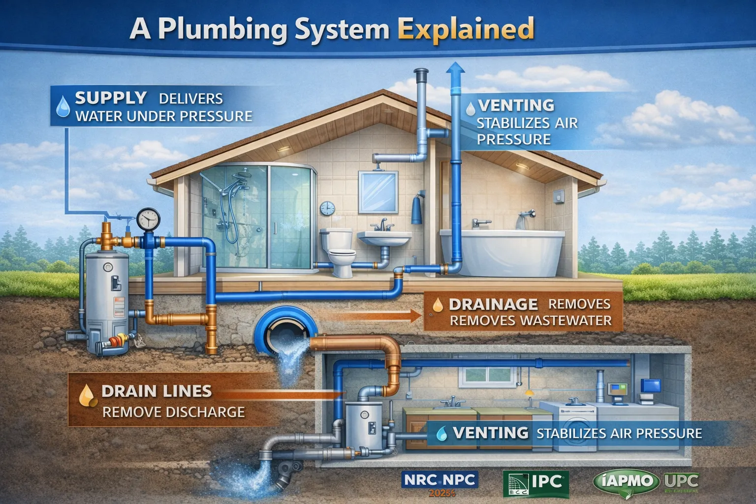 Plumbing is the set of supply lines, drain lines, and vent paths that work together so water arrives clean and wastewater exits without health risk. That “what is plumbing system” phrasing usually points to the three-part relationship: supply pressure feeds fixtures, drainage carries discharge, and venting stabilizes air pressure so traps hold their seal, a concept covered in major code families like NRC NPC 2020, ICC IPC, and IAPMO UPC.