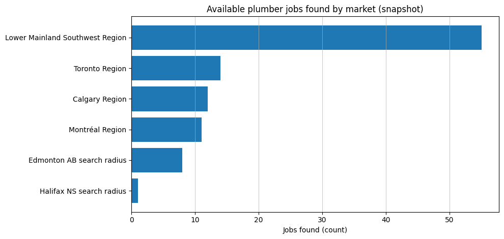 | Market as named on the portal | Available plumber jobs found | Notes that keep the compare fair |