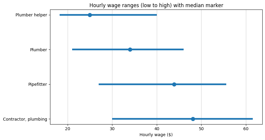| Plumbing contractor | Runs jobs, crews, bids, schedules, compliance | Trade background plus business setup | Canada hourly low 30.00, median 48.10, high 61.52 updated Nov 19, 2025; reference period 2023 to 2024; Employment Insurance Survey Data | Highest benchmark in this set, ownership and leadership track |